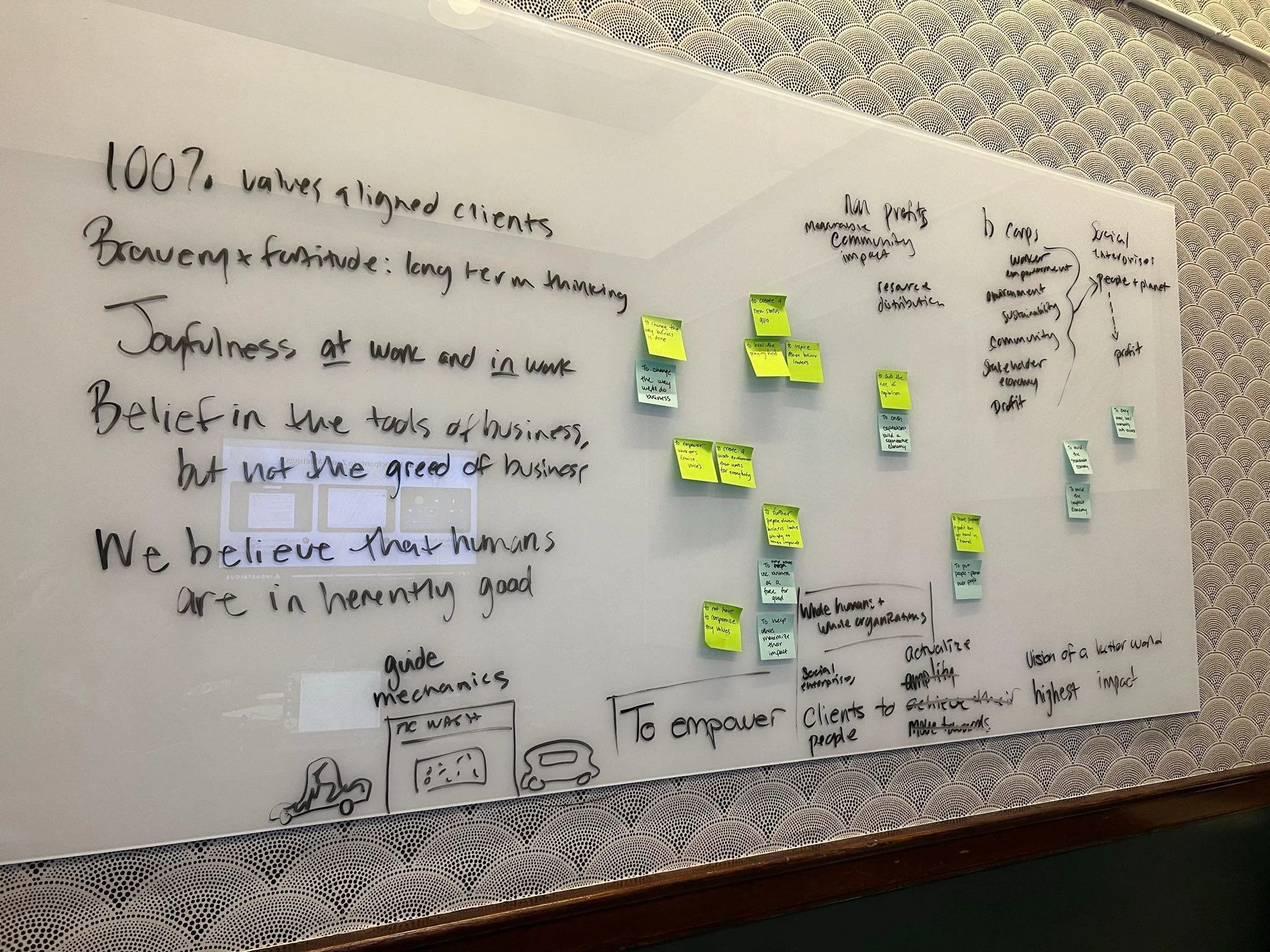 We wrote as many answers as we could think of on those sticky notes and put them on the whiteboard. Then we talked through all of them, and kept asking “why?” For example, we stated that we are in business to help companies implement impact strategies. But why? So they are clear about how to use their unique skills and resources to make the most impact possible. But why? And so on and so on. Then we connected that to the value we provide our clients and what makes us unique. The conversations we had as a part of that process proved invaluable - like how we determined that what we care about most is HUMANS. And when we say humans, we mean the whole of humans - the good, the bad, the messy, the beautiful. And we care about the equally messy organizations they make up. And we really love our clients - they inspire us daily with the amazing work they are doing. We don’t ever want to pretend we know more than they do. We want to empower them to do more of the amazing work they are already doing. After lots of these types of conversations, we eventually landed on a mission statement we both love (and can recite from memory - green flag!)